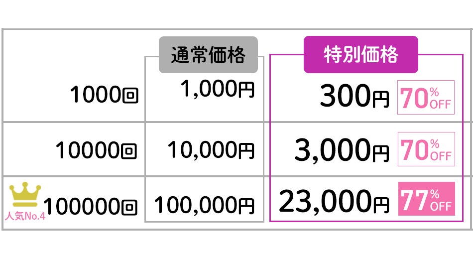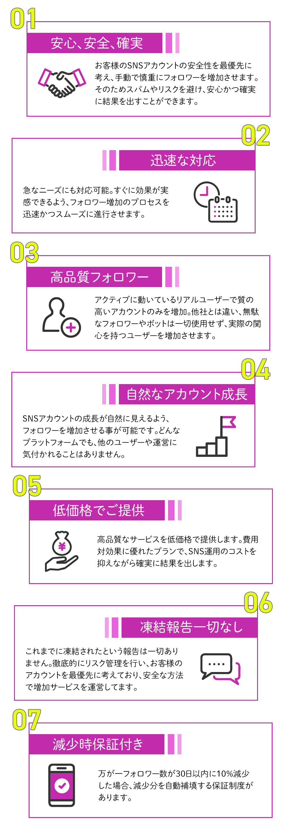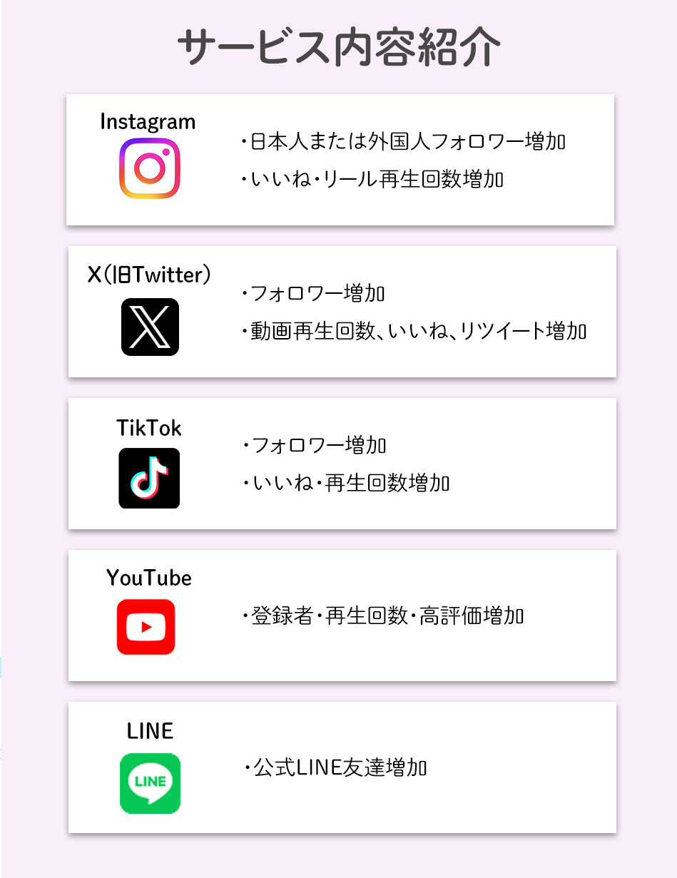 BuzzLift(バズリフト)では、お客様のSNSアカウントのフォロワー数やいいね数などを増加させ、アカウントの信頼性を高めることで、より多くの目に触れるチャンスを提供します。フォロワーの質にこだわり、プロフェッショナルな印象を与えるための第一歩をサポートします。これにより、SNSでの影響力を強化し、自信を持ってSNS戦略を展開できます。あなたの成長を支援するパートナーとして、確実な結果をお約束します! 日本人フォロワー 外国人フォロワー 日本人いいね リール再生回数 日本人フォロワー 日本人いいね インプレッション 日本人リツイート 外国人フォロワー いいね 再生回数(日本エリア) 共有 登録者(日本エリア) 再生回数 高評価 LINE公式友達 日本人フォロワー 外国人フォロワー 日本人いいね リール再生回数 日本人フォロワー 日本人いいね インプレッション 日本人リツイート 外国人フォロワー いいね 再生回数(日本エリア) 共有 登録者(日本エリア) 再生回数 高評価 LINE公式友達 SNS増加サービスは本当に効果がありますか? はい、当サービスは多くの実績を持っており、ターゲットに合わせたフォロワー増加を実現しています。質の高いフォロワーを増加させることで、リアクションやエンゲージメントの向上にも繋がります。実際に多くのお客様から、フォロワー数の増加だけでなく、売上や予約数、ファンの獲得、 おすすめ(人気投稿)上位に表示されたといった成果が報告されています。 SNSアカウントが凍結されることはありませんか? 当社では、SNSプラットフォームの規約を厳守した方法で増加をサポートしています。そのため、不正な手段やスパム行為を行うことは一切ありません。これまでに一般のお客様から飲食業界、美容業界、著名人、大手企業まで累計25,000件以上の実績がありますが、凍結報告は一切ありません。ご安心してご利用ください。 フォロワーの増加が止まった場合、どうなりますか? 万が一、フォロワー数が減少した場合でも、減少分を補填する 保証制度を設けております。サービスを開始した後一定の結果を保証するため、もしも期待した効果が得られない場合でも安心です。 他のSNSサービスと何が違うのでしょうか? 当サービスは、これまで数多くの企業やインフルエンサーのSNS成長を支援してきた確かな実績があります。高品質なフォロワーを増加させることに重点を置いています。他のサービスと異なり、無駄なボットアカウントや低品質なフォロワーは一切使用せず実際に関心を持つユーザーを増加させることで、エンゲージメントやリーチも向上する点が他のサービスとの大きな違いです。 どのSNSプラットフォームにも対応していますか? はい、Instagram、X(旧Twitter)、TikTok、YouTube、LINEなど、主要なSNSプラットフォームに対応しています。お客様のニーズに合わせたSNSでサービスを提供いたしますので、ご希望のプラットフォームでお試しいただけます。 サービスの料金はどのくらいですか? 当サービスは、SNS増加サービスを格安で提供しています。 料金はプランごとに異なりますが、お客様にとってコストパフォーマンスの良いプランをご提供しています。まずは気軽にお問い合わせ下さい。 サービスを始めるのに必要な時間はどのくらいですか? ご依頼いただいてから、サービスが始まるまでの時間は通常 24時間以内です。 私のアカウントに合ったプランはどう選べば良いですか? お客様の目標やニーズに合わせて、最適なプランを提案いたします。たとえば、インフルエンサーを目指す方や、ビジネスの認知度を高めたい方には、フォロワー数を増加させるプランをご用意しています。まずはご相談いただければ、最適なプランをアドバイスいたします。 SNS増加サービスは本当に効果がありますか? はい、当サービスは多くの実績を持っており、ターゲットに合わせたフォロワー増加を実現しています。質の高いフォロワーを増加させることで、リアクションやエンゲージメントの向上にも繋がります。実際に多くのお客様から、フォロワー数の増加だけでなく、売上や予約数、ファンの獲得、 おすすめ(人気投稿)上位に表示されたといった成果が報告されています。 SNSアカウントが凍結されることはありませんか? 当社では、SNSプラットフォームの規約を厳守した方法で増加をサポートしています。そのため、不正な手段やスパム行為を行うことは一切ありません。これまでに一般のお客様から飲食業界、美容業界、著名人、大手企業まで累計25,000件以上の実績がありますが、凍結報告は一切ありません。ご安心してご利用ください。 フォロワーの増加が止まった場合、どうなりますか? 万が一、フォロワー数が減少した場合でも、減少分を補填する 保証制度を設けております。サービスを開始した後一定の結果を保証するため、もしも期待した効果が得られない場合でも安心です。 他のSNSサービスと何が違うのでしょうか? 当サービスは、これまで数多くの企業やイ